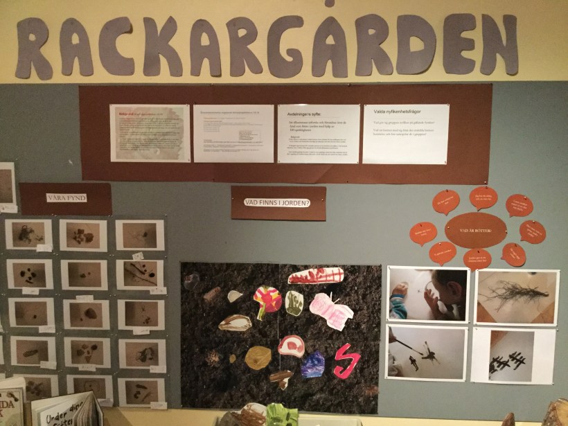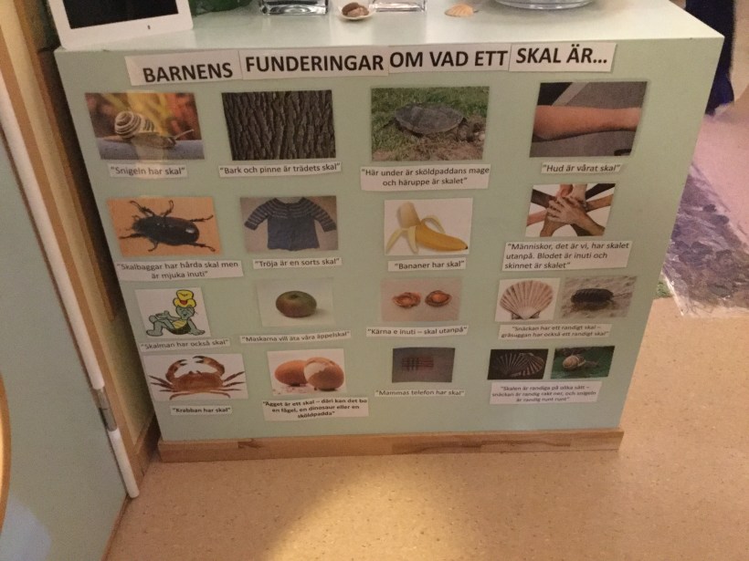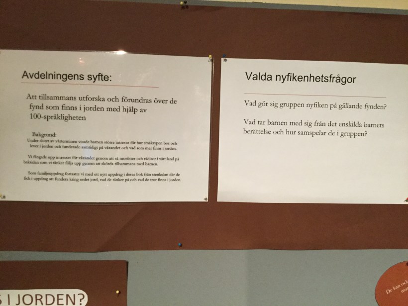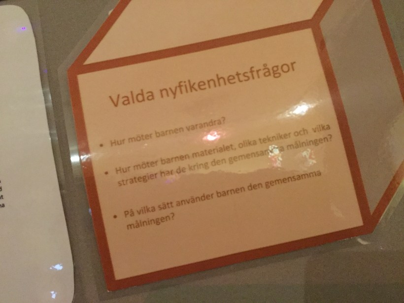 Ytterligare en sak jag tar med mig är de tydliga frågorna som sitter tillsammans med dokumentationen. Syfte och nyfikenhetsfrågor. Överallt blir barn och pedagoger på påminda om projektet och de frågor de formulerat tillsammans. Detta tror jag är en oerhörd hjälp till att hålla fokus och stanna i det man sagt från början. Dessutom är väggarna fyllda av barnens teorier och tankar, vilket hjälper till i valen av projektens riktning.