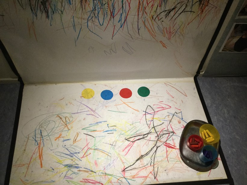 Tre burkar med kritor men fyra cirklar med färg. För oss betydde det att miljön frågar barnen: Du kan rita rött, blått och gult med kritorna, men hur ska du göra för att rita grönt?