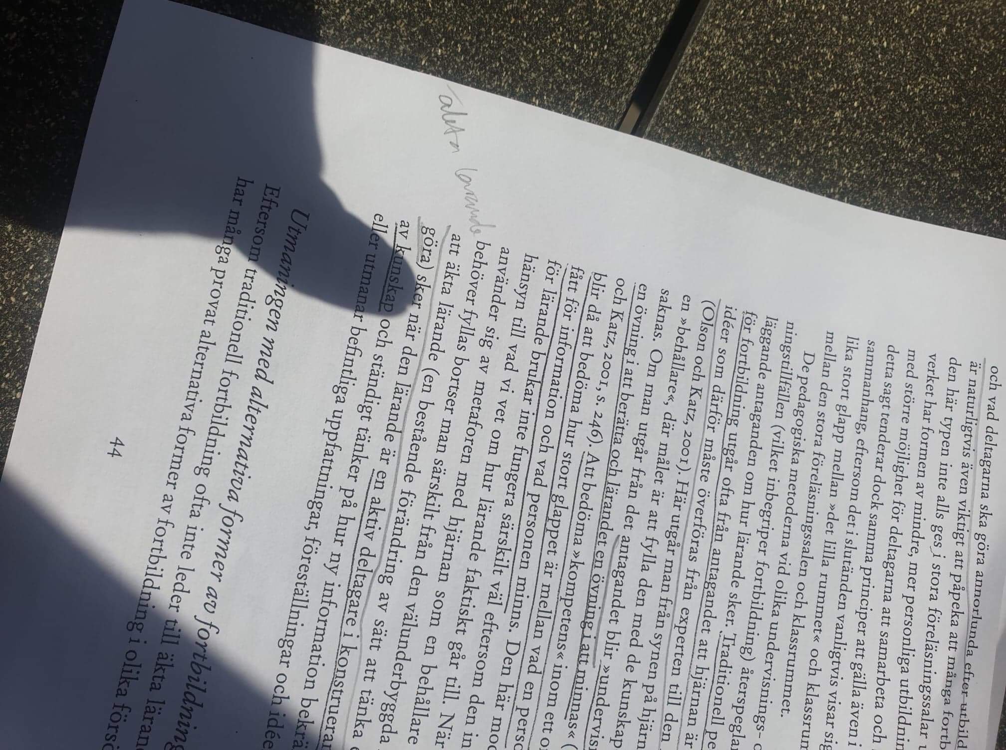 Men vi tillhör också de människor som faktiskt tycker det är roligt att göra förändringar, göra på nya sätt. Kanske tillhör alla människor den kategorin, alla kanske bara inte vet om det. Ett lärande ska leda till en bestående förändring i hur vi tänker eller gör, menar författarna Ain Dack och Katz. Vi ställer oss frågan om det kan vara ett lärande om man inte själv vet om det? Man kanske inte vet att man förändrats? Eller kommer att förändras. Vi är överens om (ja tänk) att det är i kollektivet som vi lär oss, tillsammans med varandra. Men vad vi lär oss, det beror på våra erfarenheter och förväntningar. I kollektivet är individens bidrag avgörande. Det måste finnas tid för att få tänka själv och pröva själv innan man kan förväntas att göra det tillsammans med andra. Man säger att människan blir tillsammans med andra, absolut är det så, men det finns också en viktig kraft och ett behov i att vara själv.