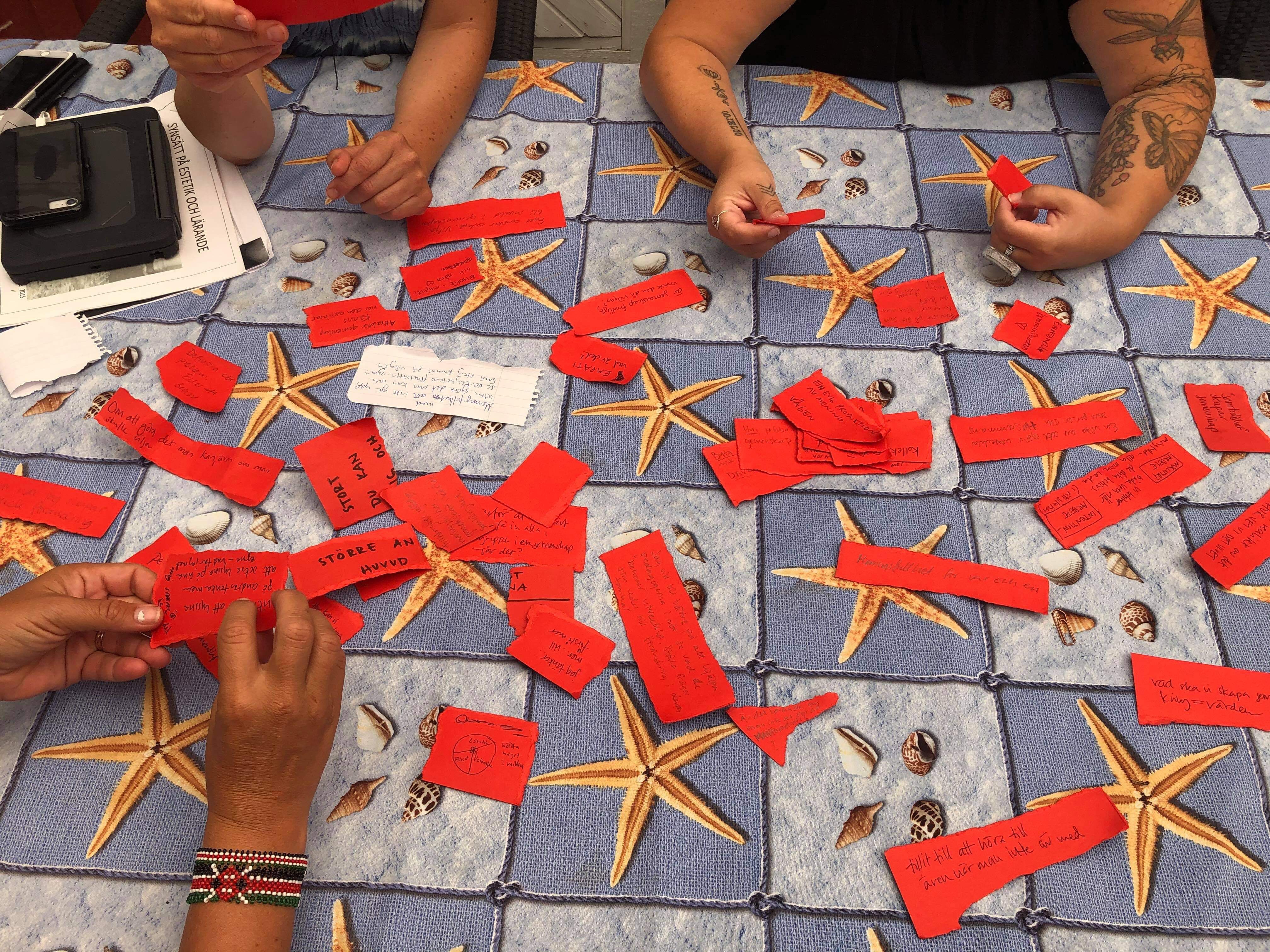 Kan det vara värden vi pratar om. I en attraktiv gemenskap sker en evig produktion av mening. Det skriver Hege Hansson i boken “Att ge FORM åt förskolans innehåll” och vi är beredda att hålla med. Hur svårt det än må låta. Tänk en evig produktion, som inte startar i något och som aldrig tar slut. Som bara fortsätter in i oändligheten. Vilka krav ställer det på vår existens? “Estetiken leder oss in på vikten av en emotionell kommunikation”. Den lilla anteckningen finns som ett spår av våra reflektioner och den har fått ett litet hjärta ritat under de viktiga orden. De viktiga men svårtolkade orden. Lapparna är ett sätt att sammanfatta och kommunicera kring vad som varit viktigt på riktigt för oss i vårt sammanhang. På bordet ligger små röda lappar med ord och symboler som blir till berättelser och ledtrådar. Både tillsammans, men också ensamma.Och med olika betydelser för var och en av oss. En attraktiv och upprymd gemenskap, den känns på riktigt när den existerar. Den behöver man inte beskriva eller förklara för andra. Den kan man bara förstå när man tillhör den. Tillit är ett viktigt ord i en sådan gemenskap och den ska gå att känna även när man inte är med på platsen.